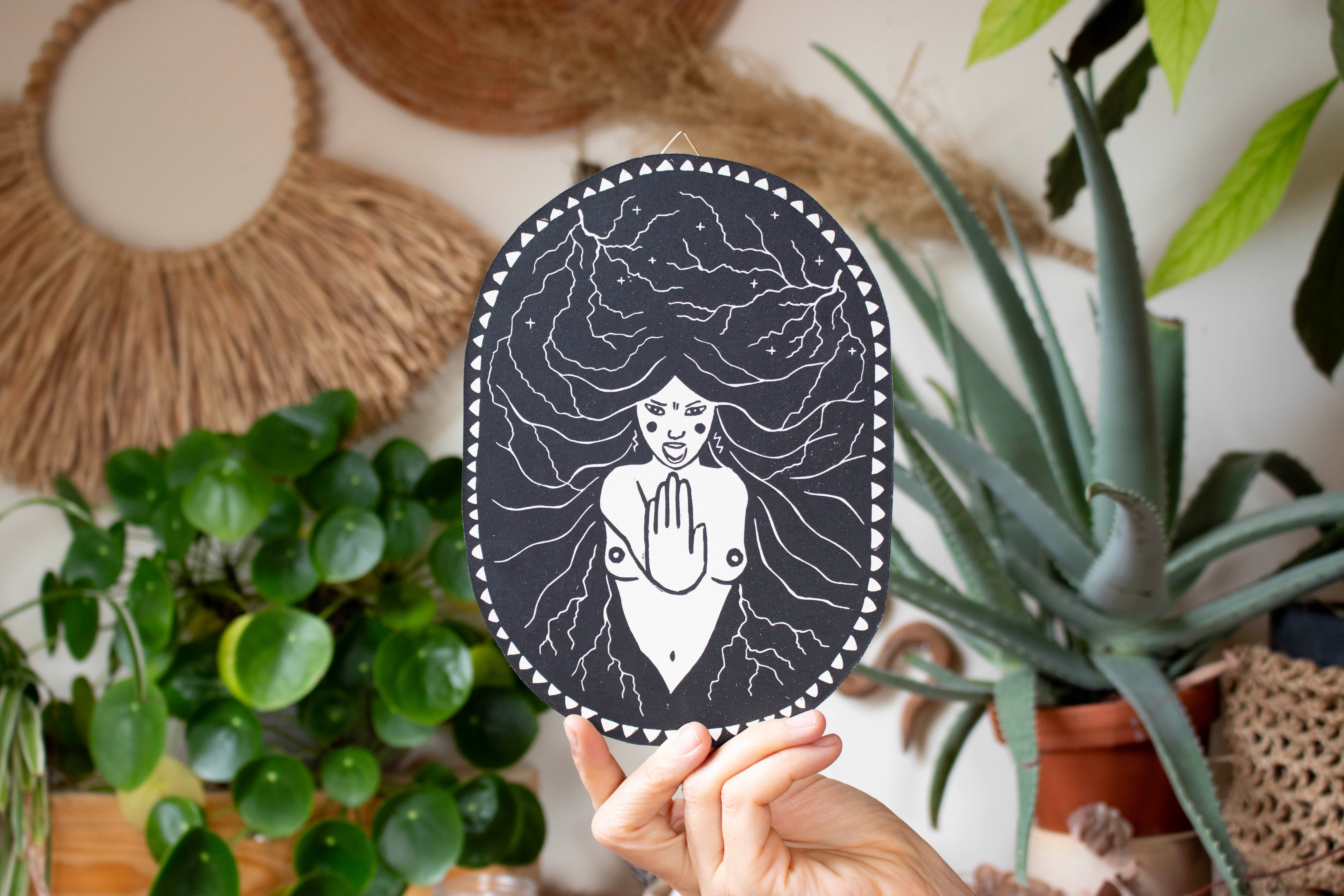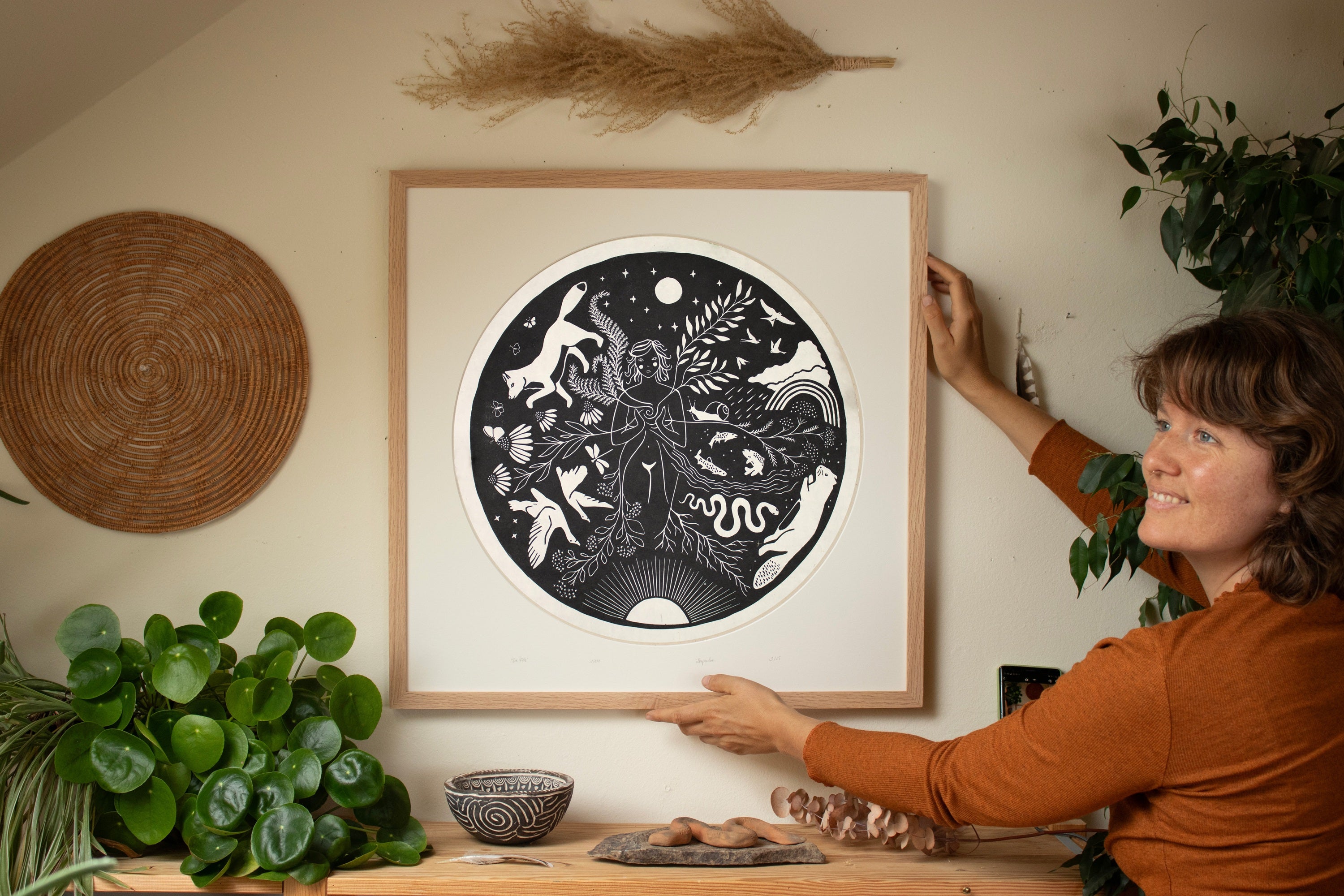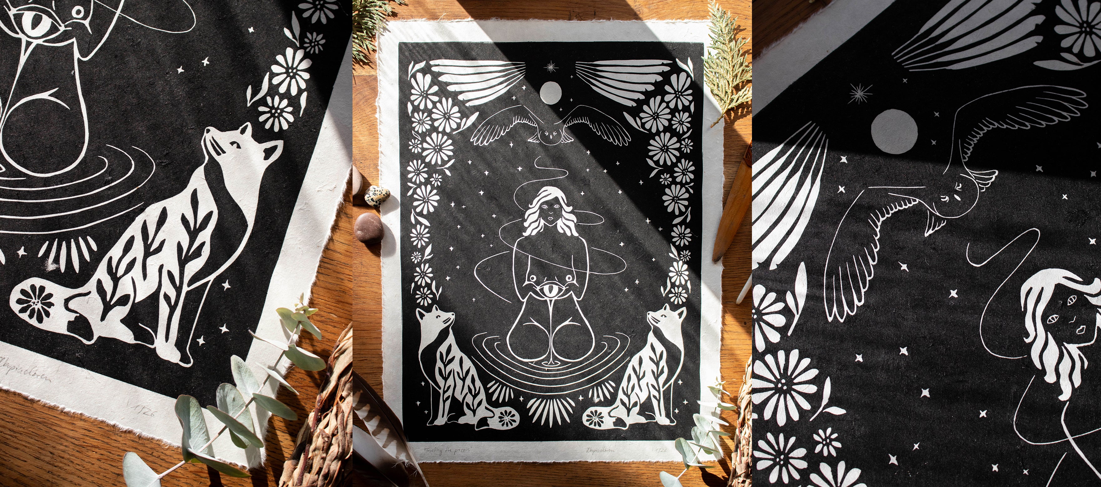 Tief berührt von der Natur um mich herum und inspiriert von der Landschaft meiner Seele, erschaffe ich durch den Linoldruck magische Kunstwerke.