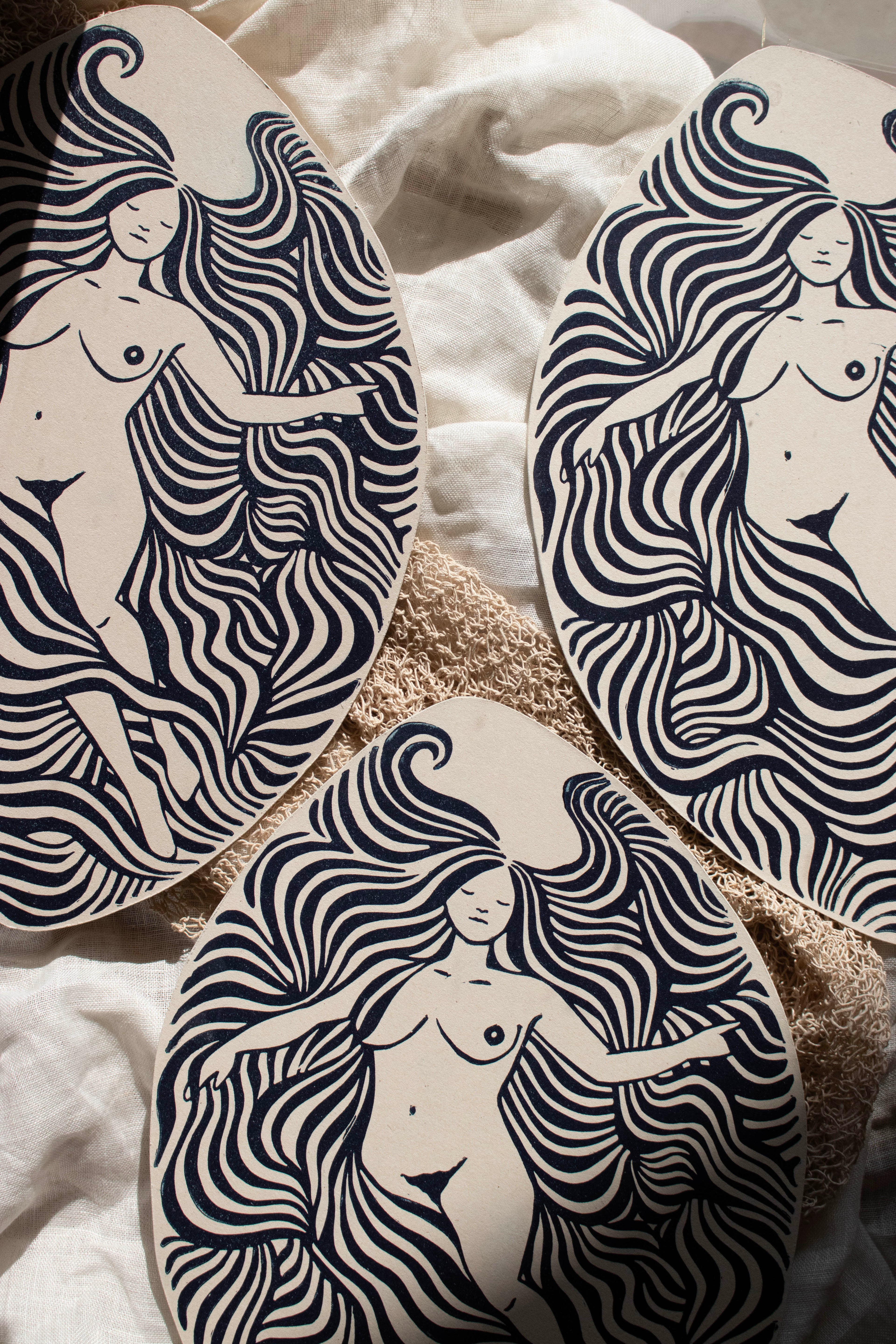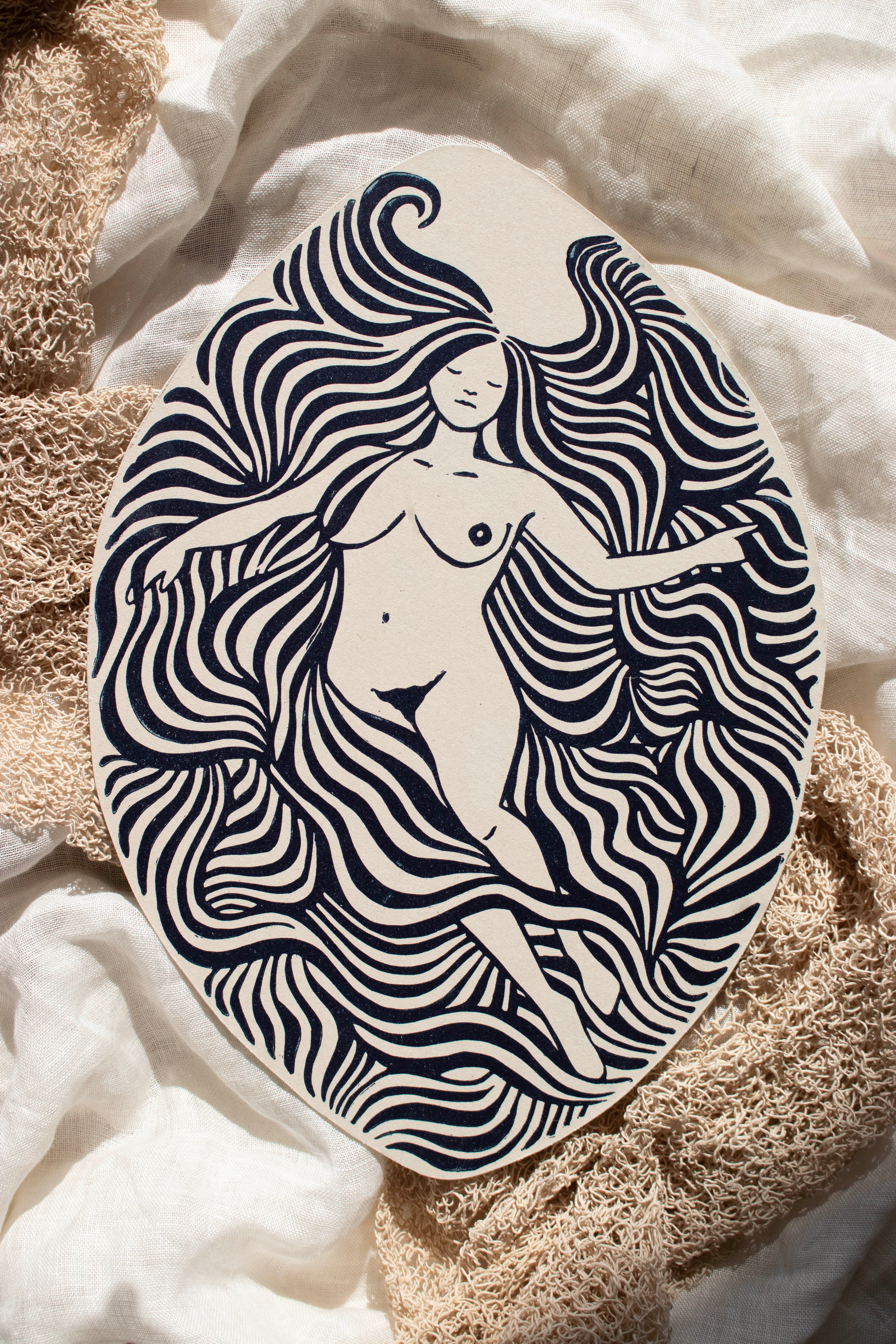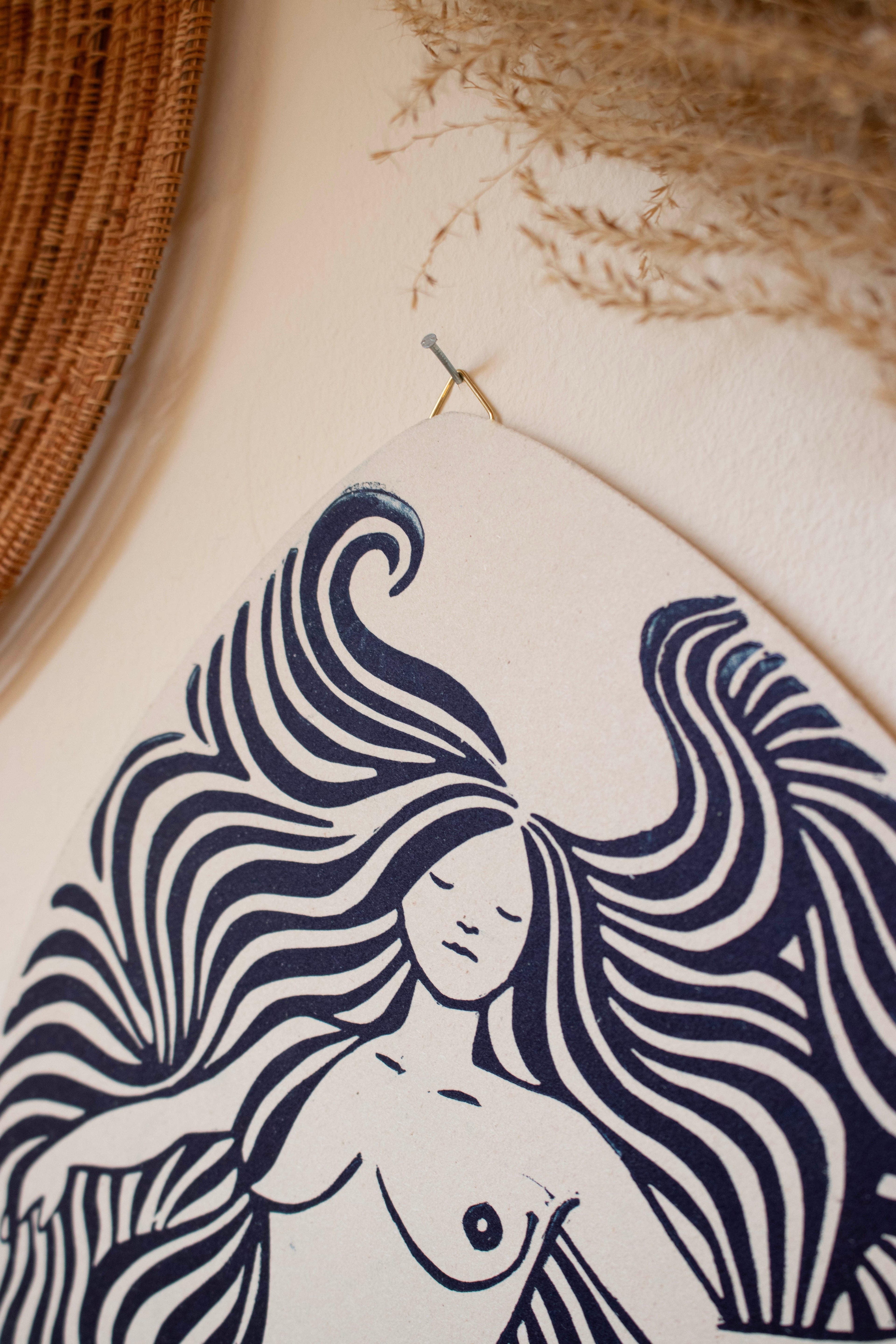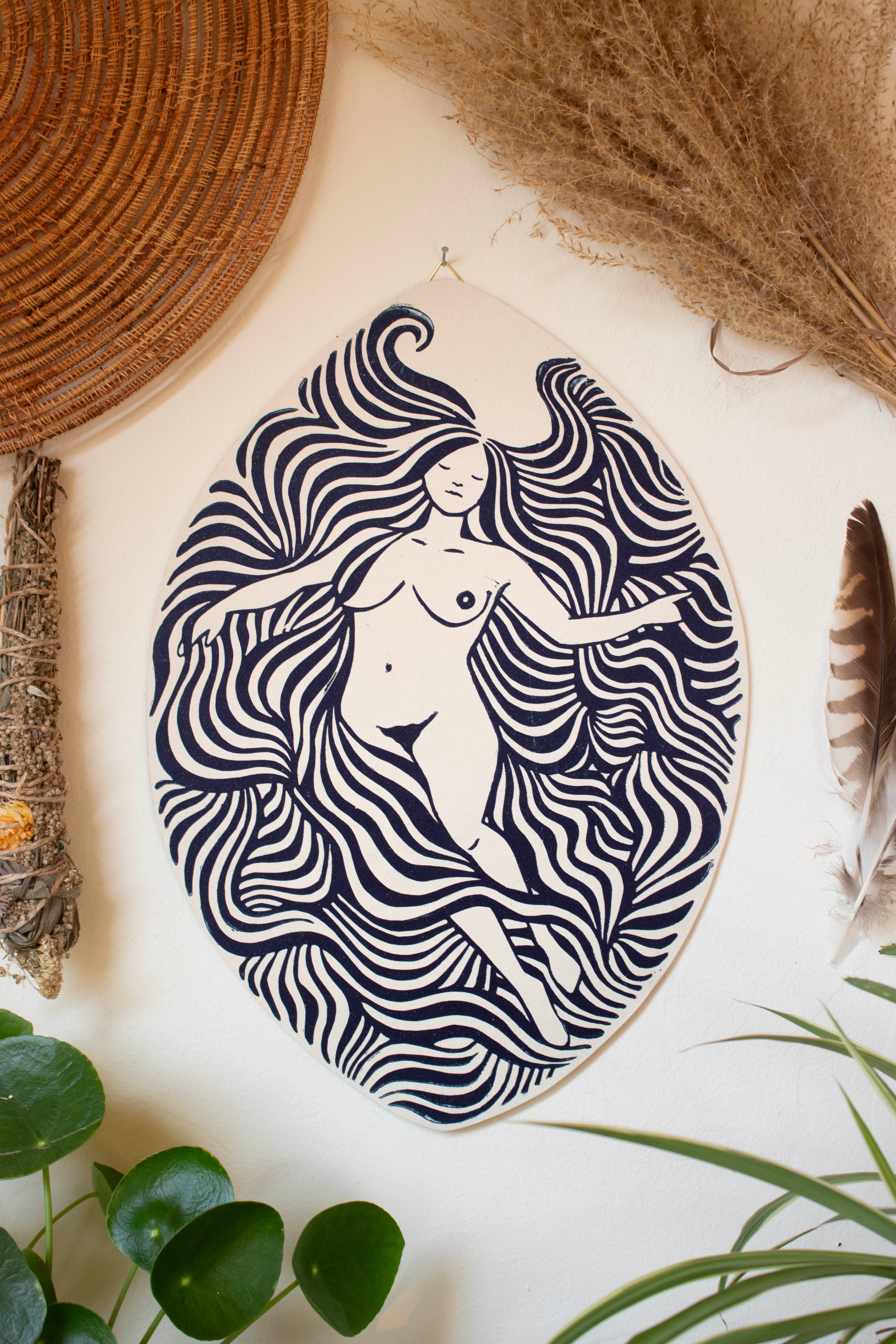 Diese Göttin lässt sich von den Wellen tragen. Ihre Haare werden selbst zu Wasser, zu Bewegung, zu Fluss. Sie kämpft nicht gegen die Wellen – sie vertraut darauf, dass sie gehalten ist.
