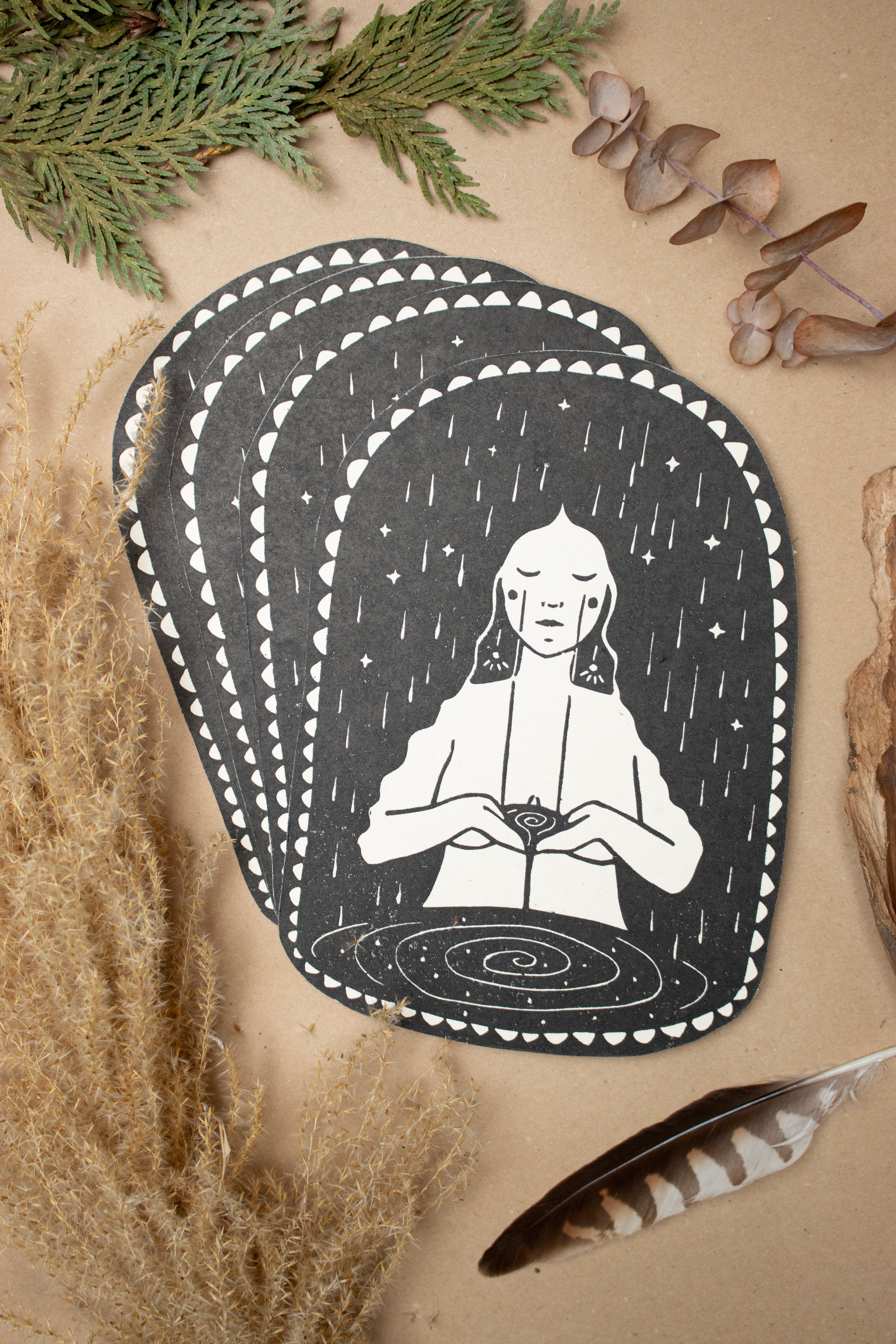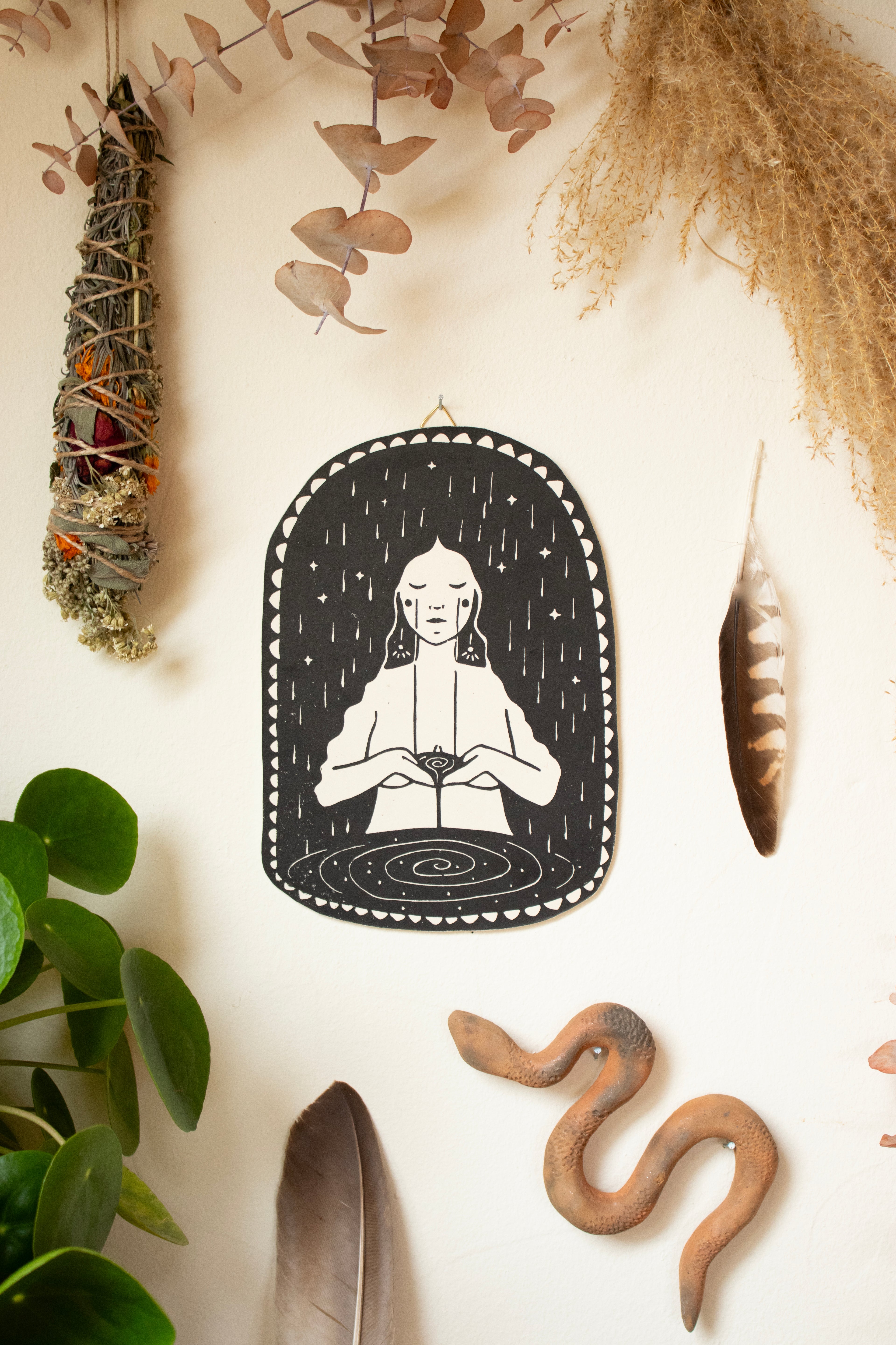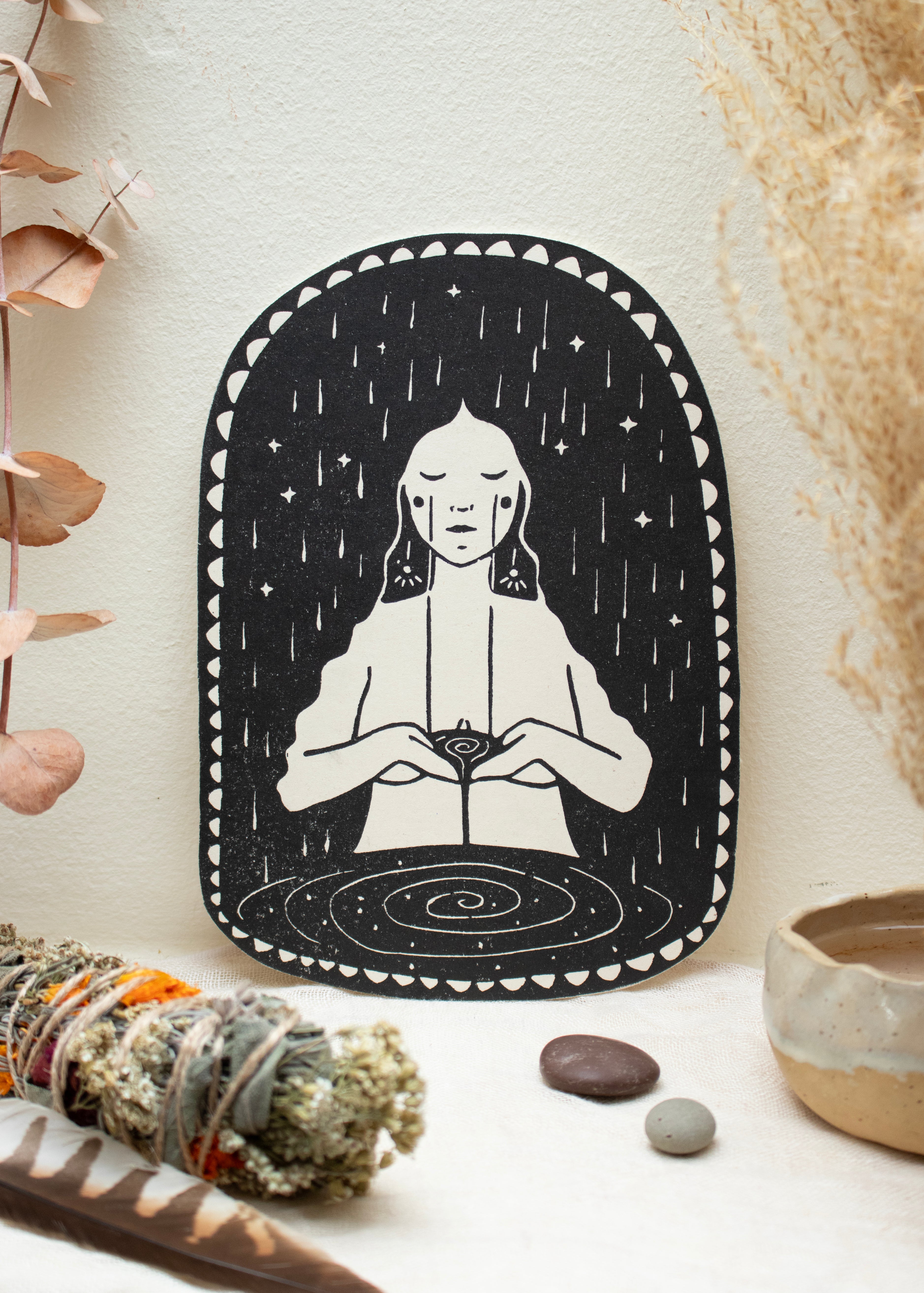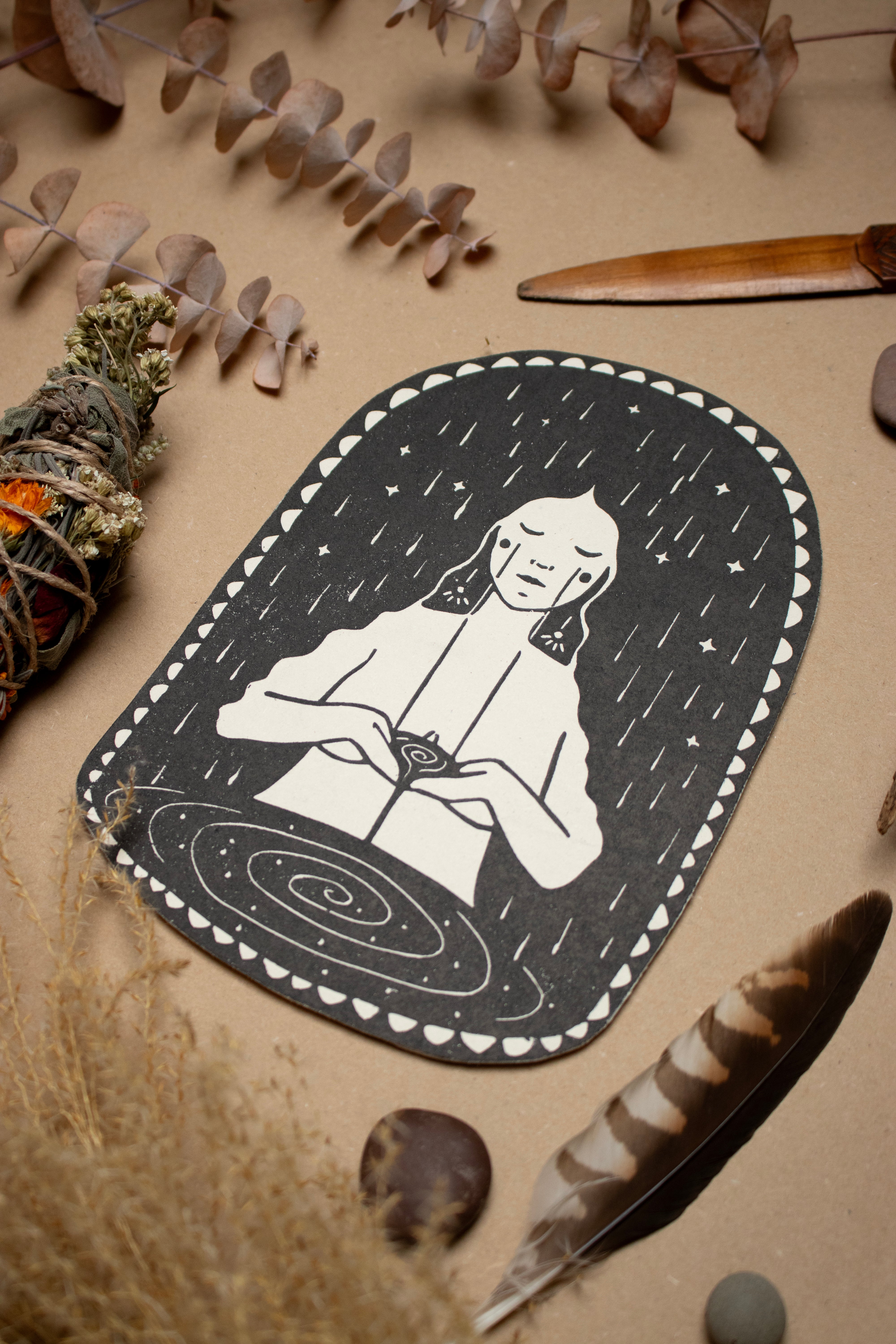 Printed on sturdy, acid-free Finnish cardboard (21.5 × 15 cm), the work can be easily hung on the wall using a small hook. Alternatively, you can fold the hook down and place the piece on your altar, shelf, or favorite place—making it an intimate companion in your everyday life. Because each print is handcrafted, each piece is a unique window into the depths of grief.