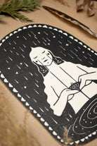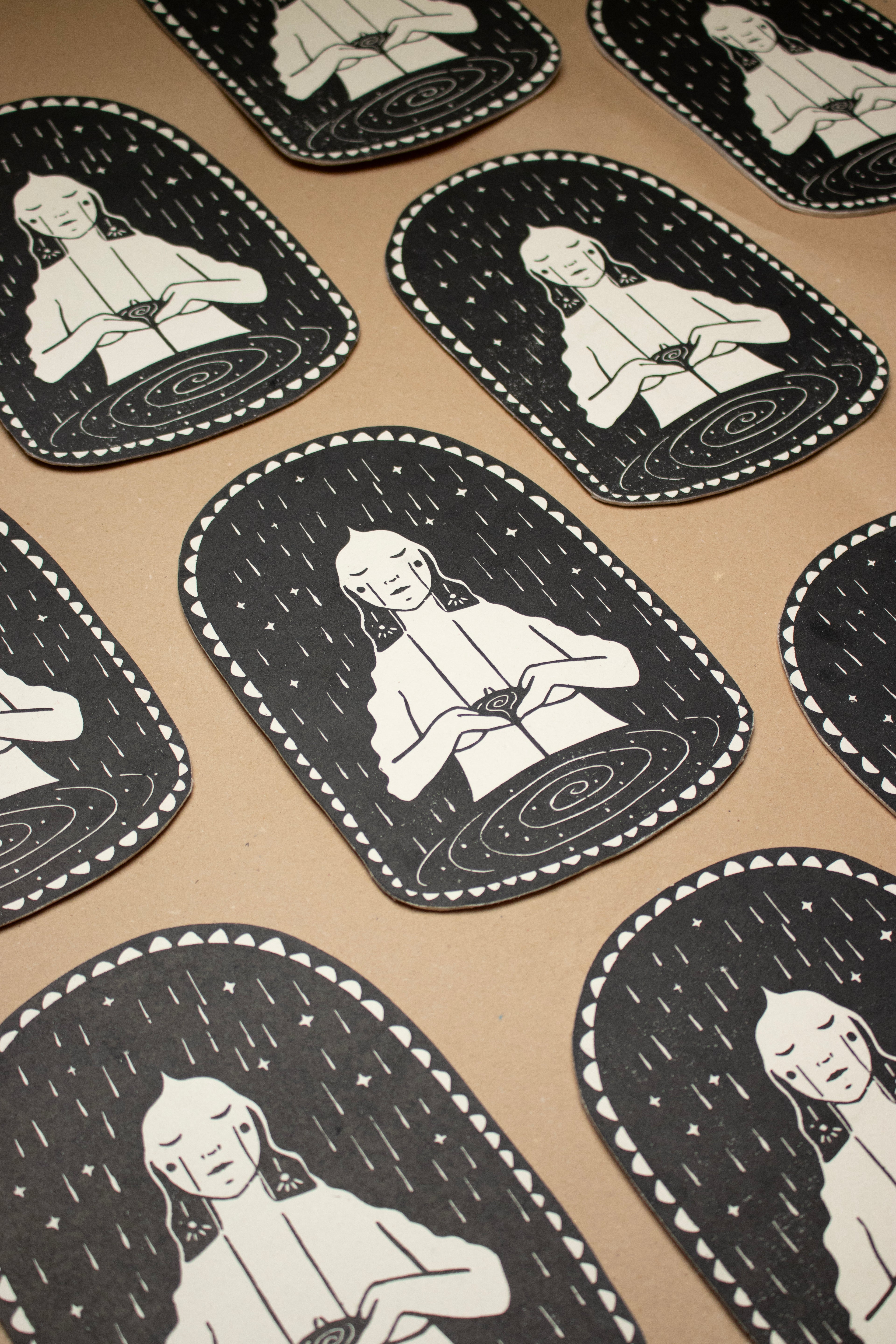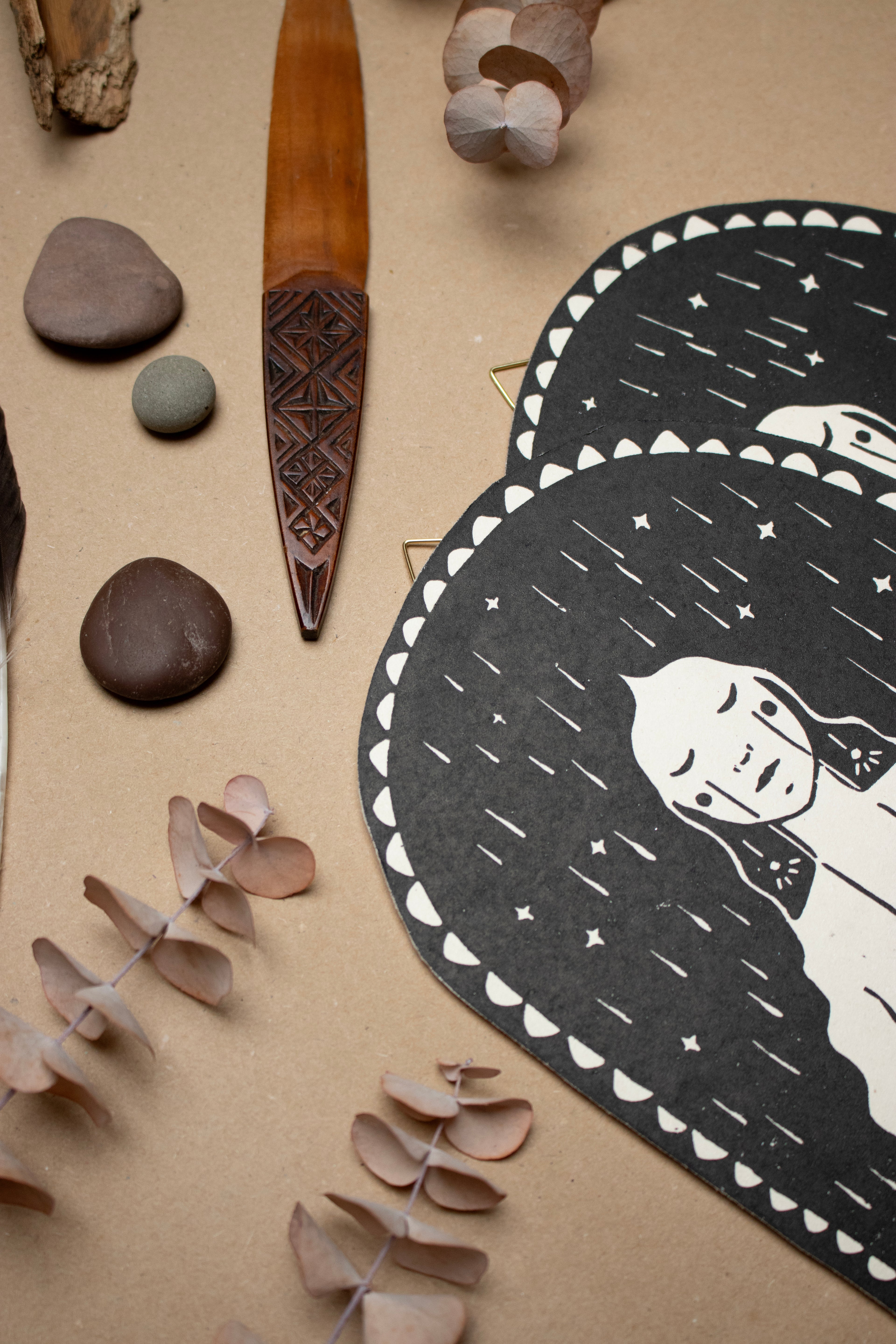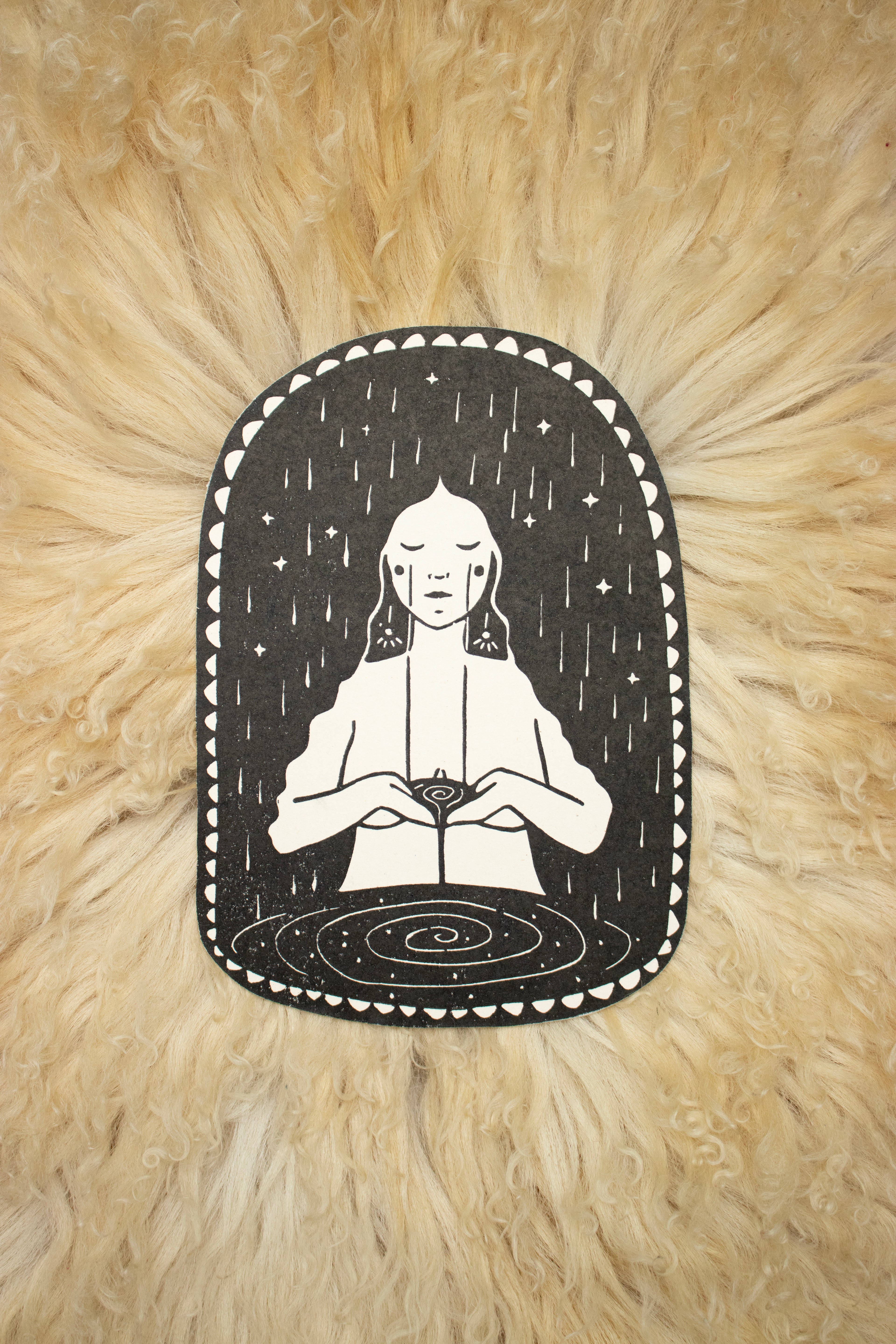 Printed on sturdy, acid-free Finnish cardboard (21.5 × 15 cm), the work can be easily hung on the wall using a small hook. Alternatively, you can fold the hook down and place the piece on your altar, shelf, or favorite place—making it an intimate companion in your everyday life. Because each print is handcrafted, each piece is a unique window into the depths of grief.