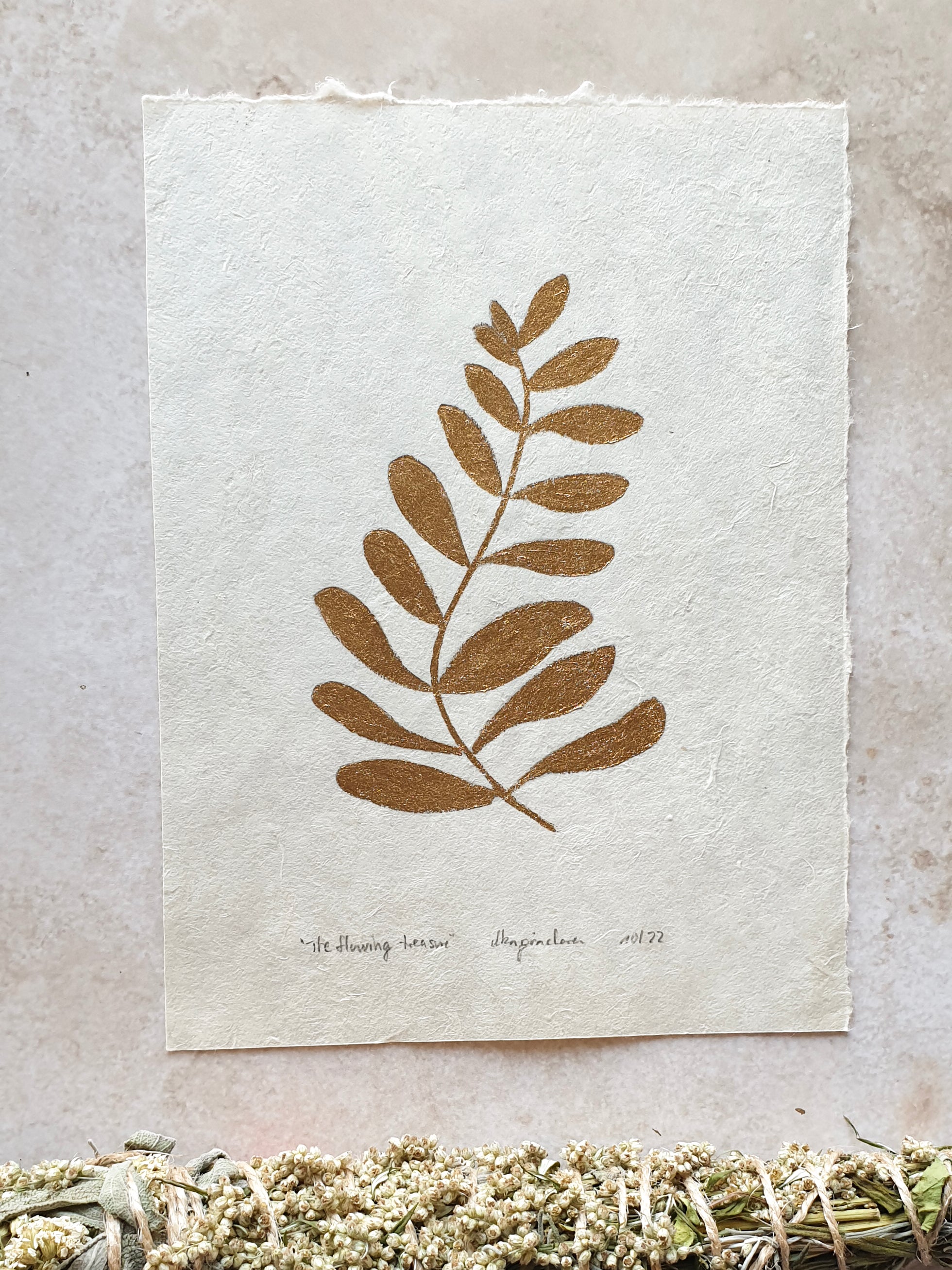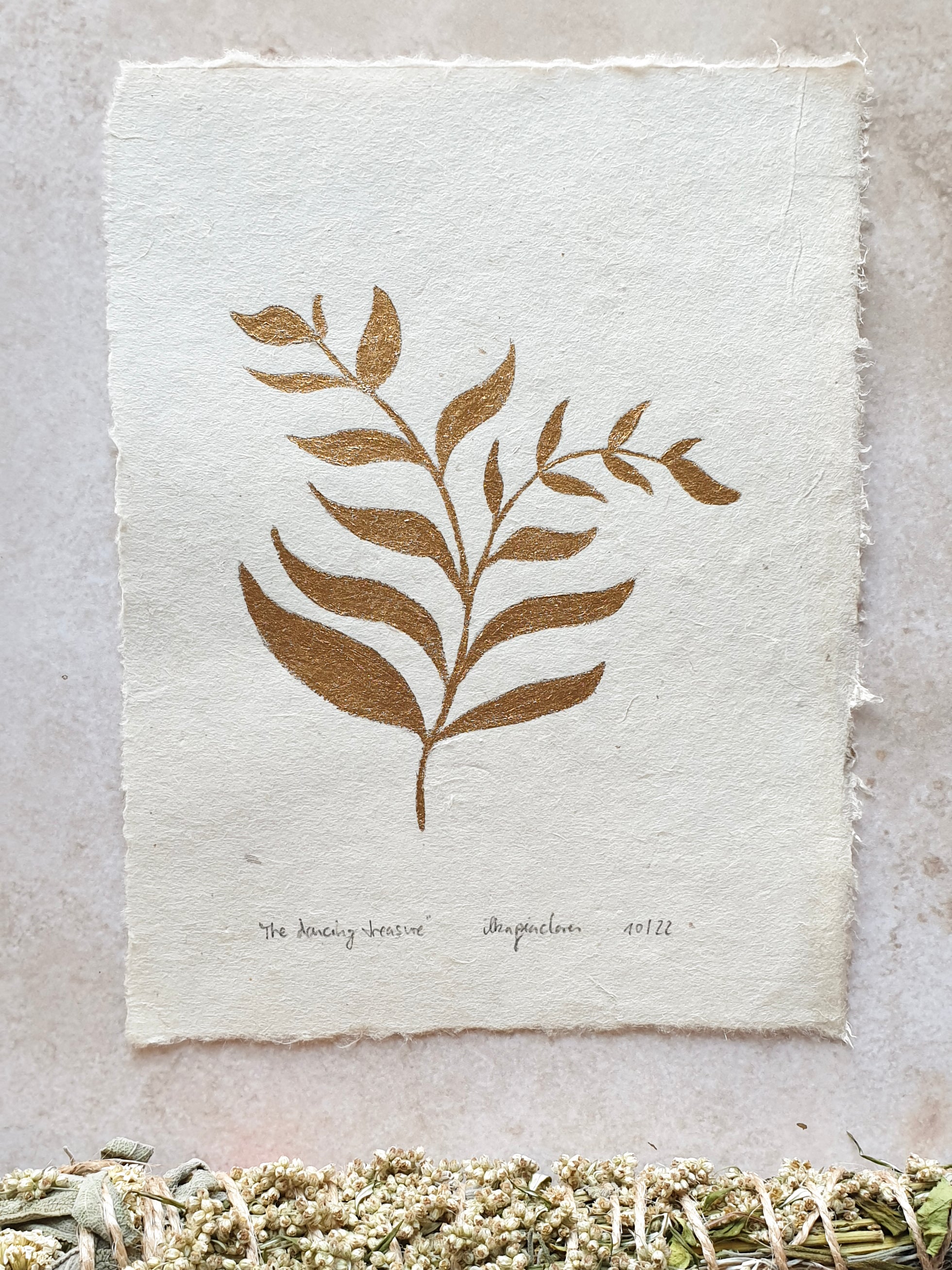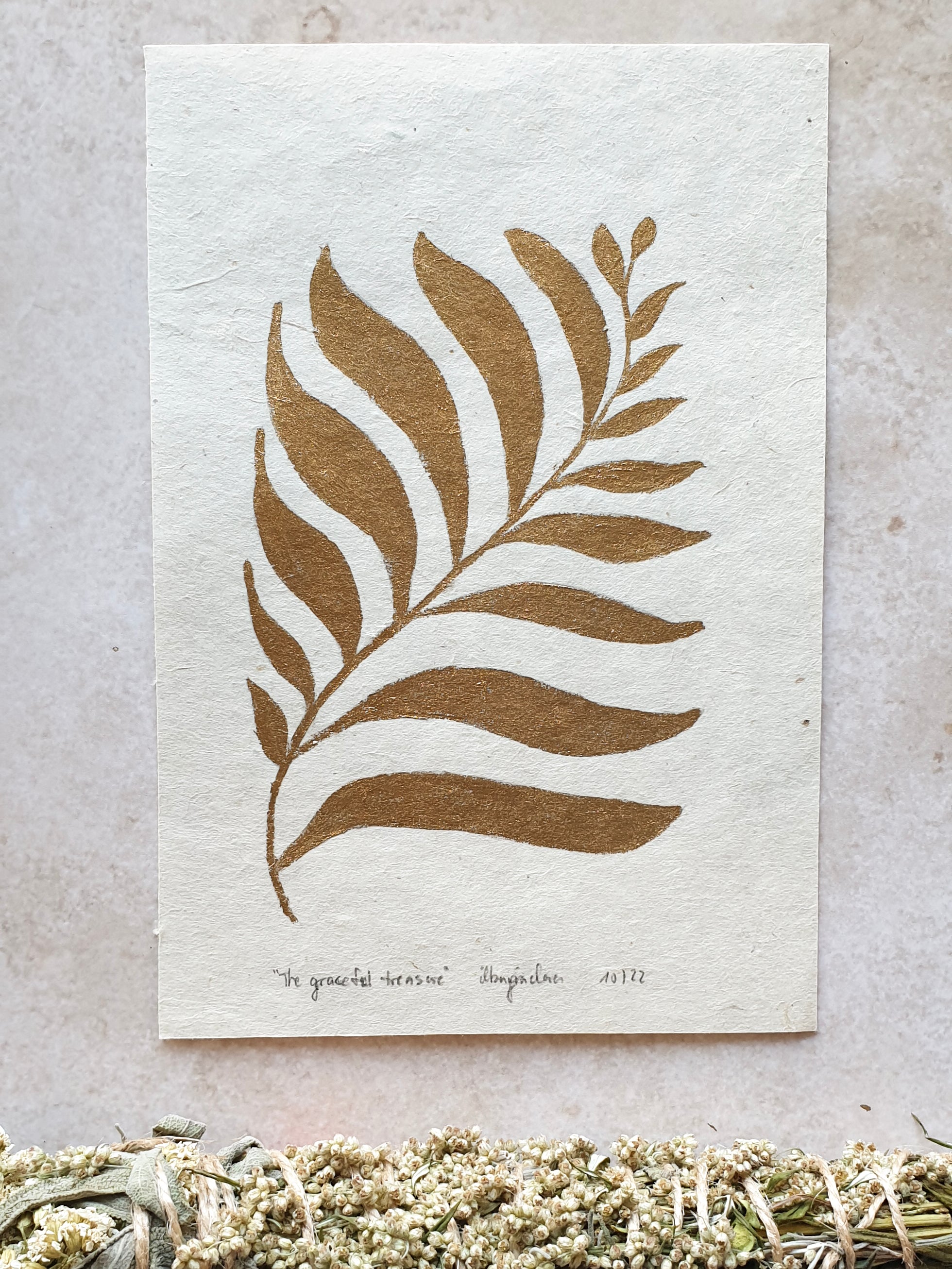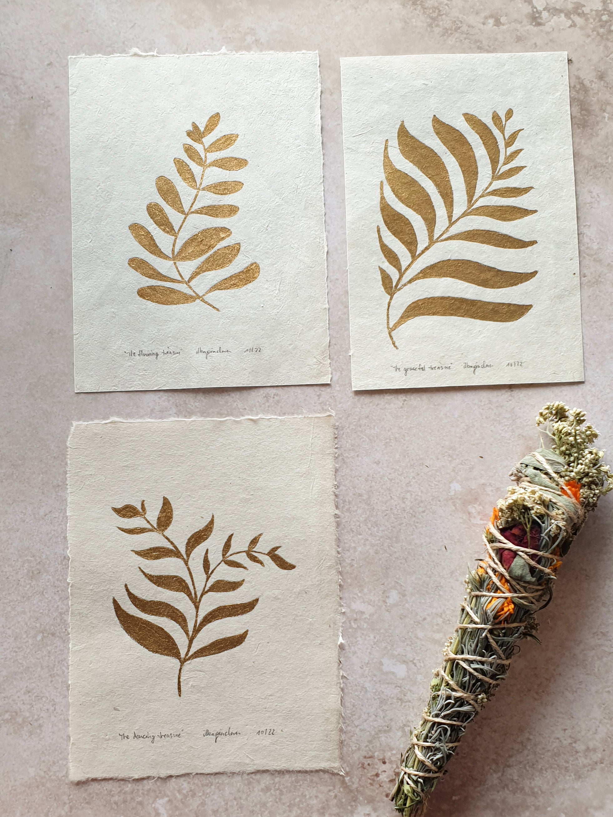 These original paintings are done with gold paint on handmade paper.