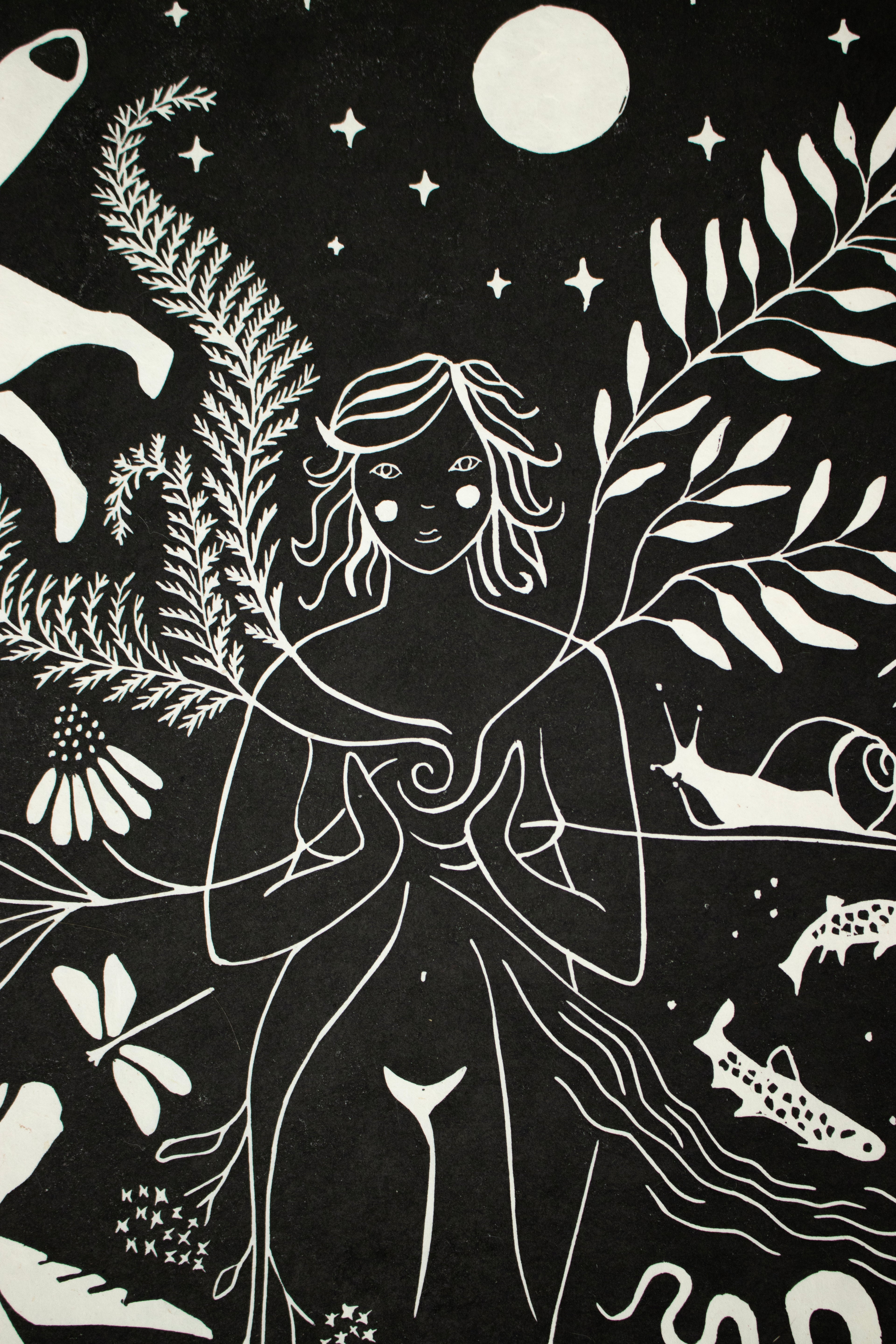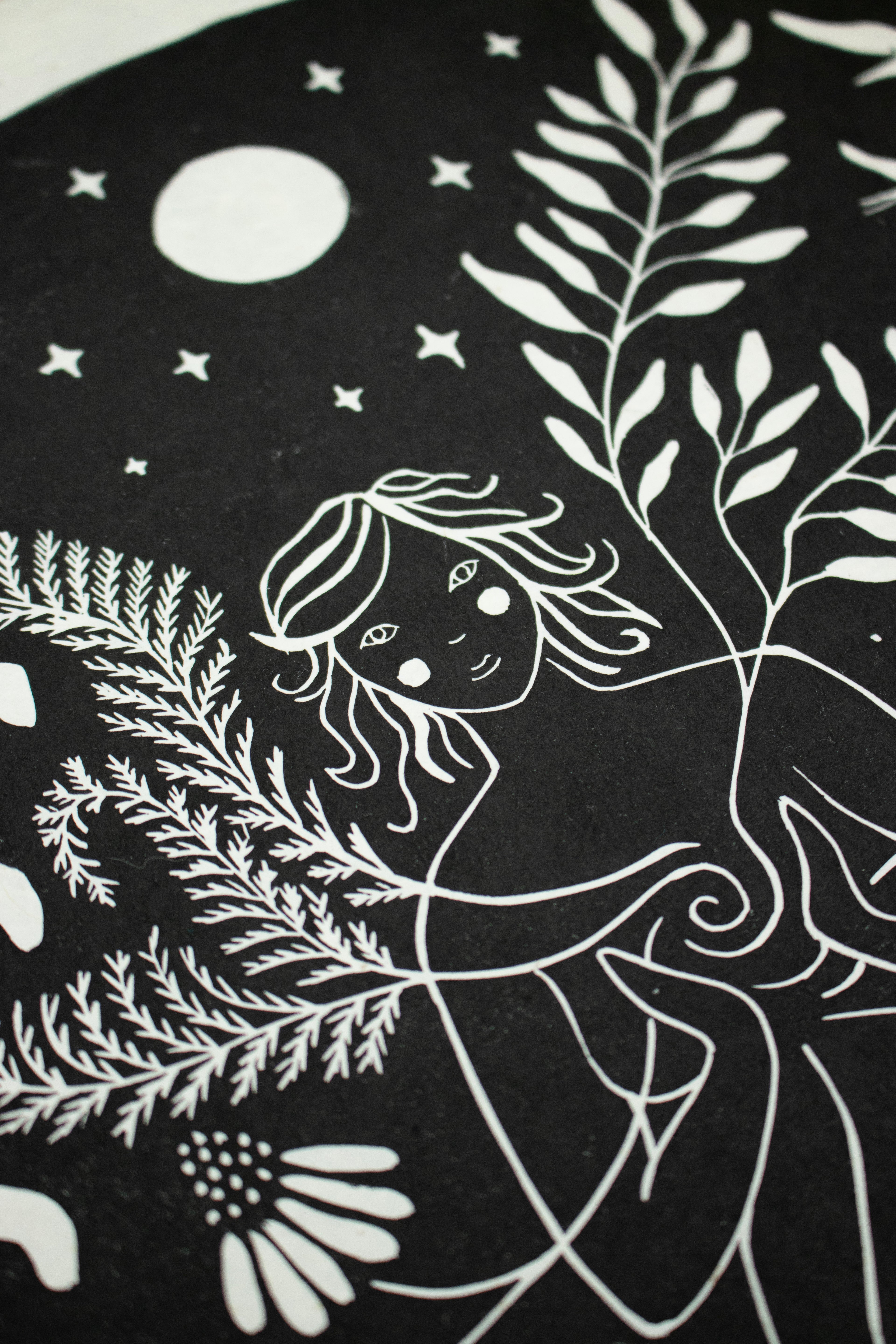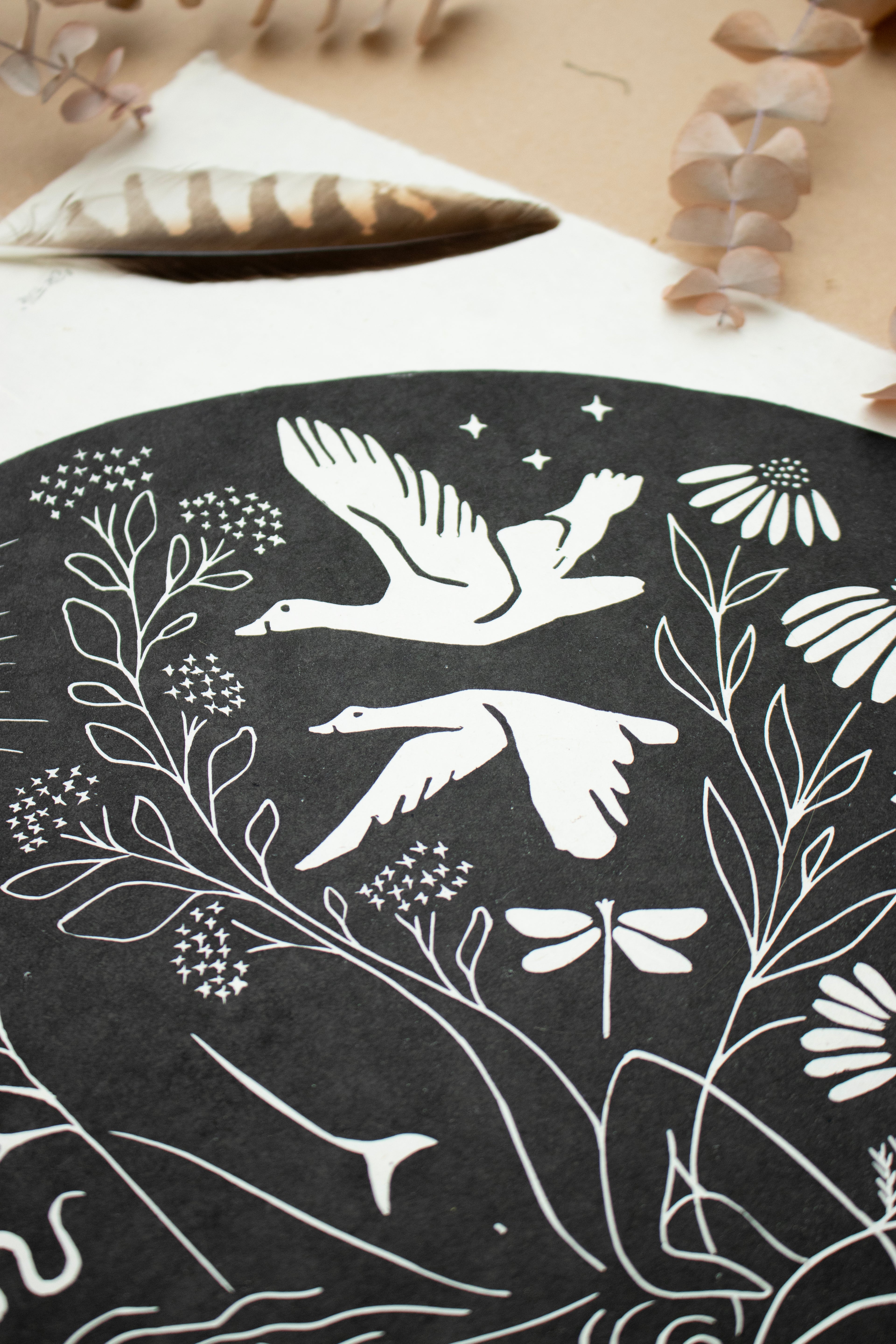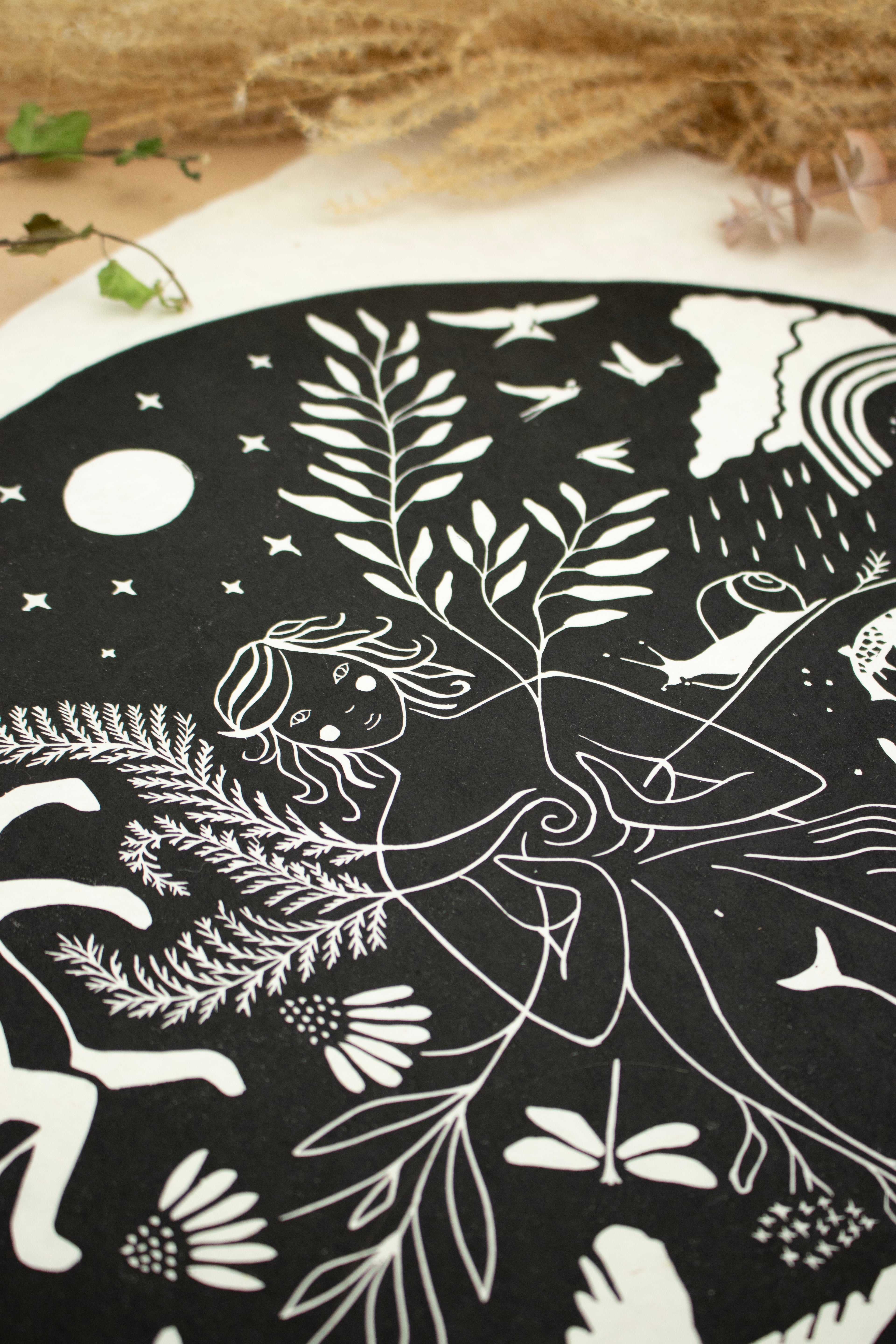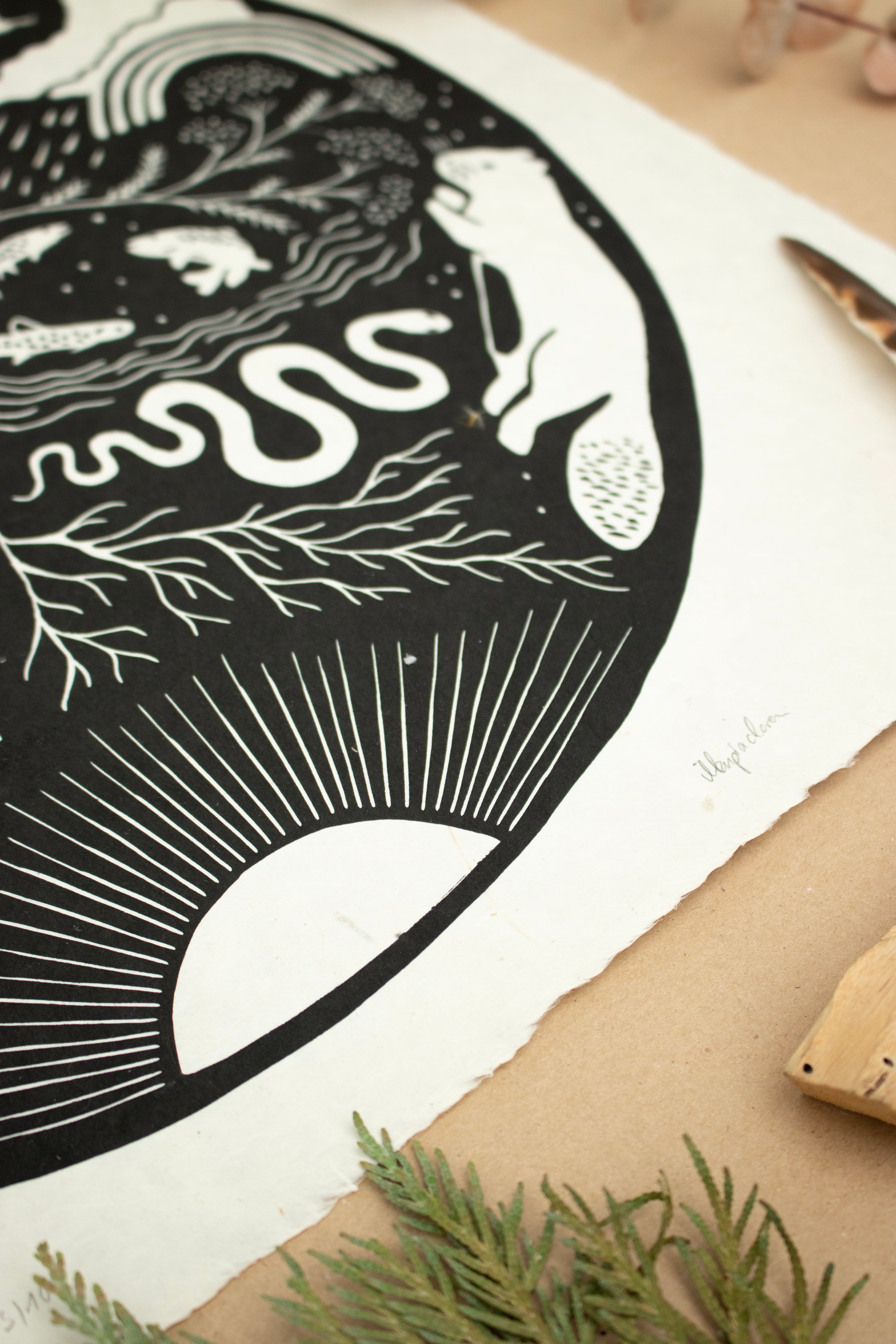 Dieser Linoldruck repräsentiert die Fülle in mir, in dir – sie entsteht aus der tiefen, immer bestehenden Verbundenheit zu all den Wesen, die ich so sehr liebe. Dieses Gefühl von Verbindung schenkt mir Freude und Ruhe – es gibt mir ein Gefühl von Zugehörigkeit und Erdung, eingebettet in eine große Familie aus Pflanzen und Tieren. Mögest auch du dich durch sie eingebettet in die Landschaft um dich herum fühlen.