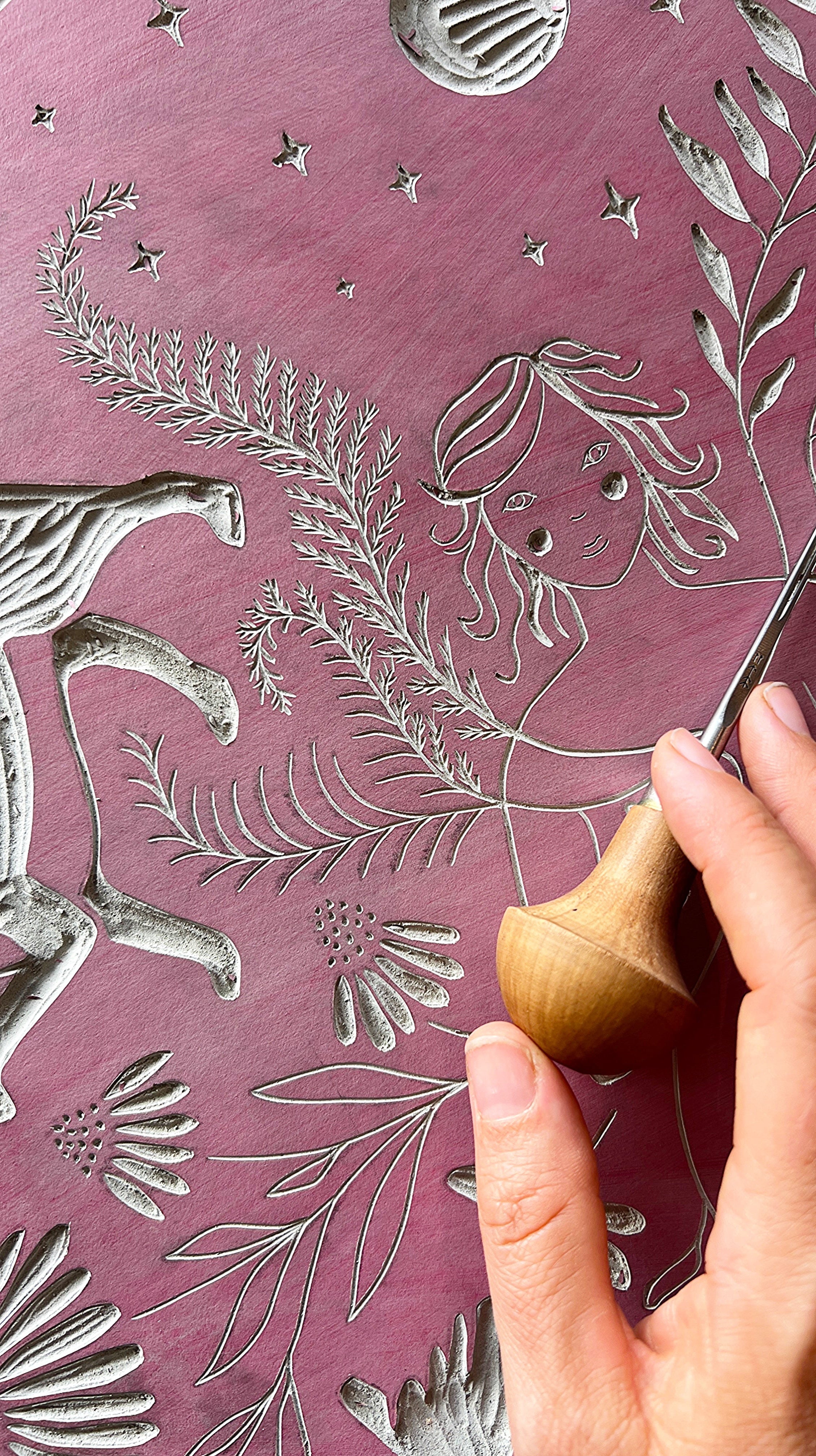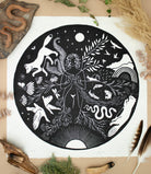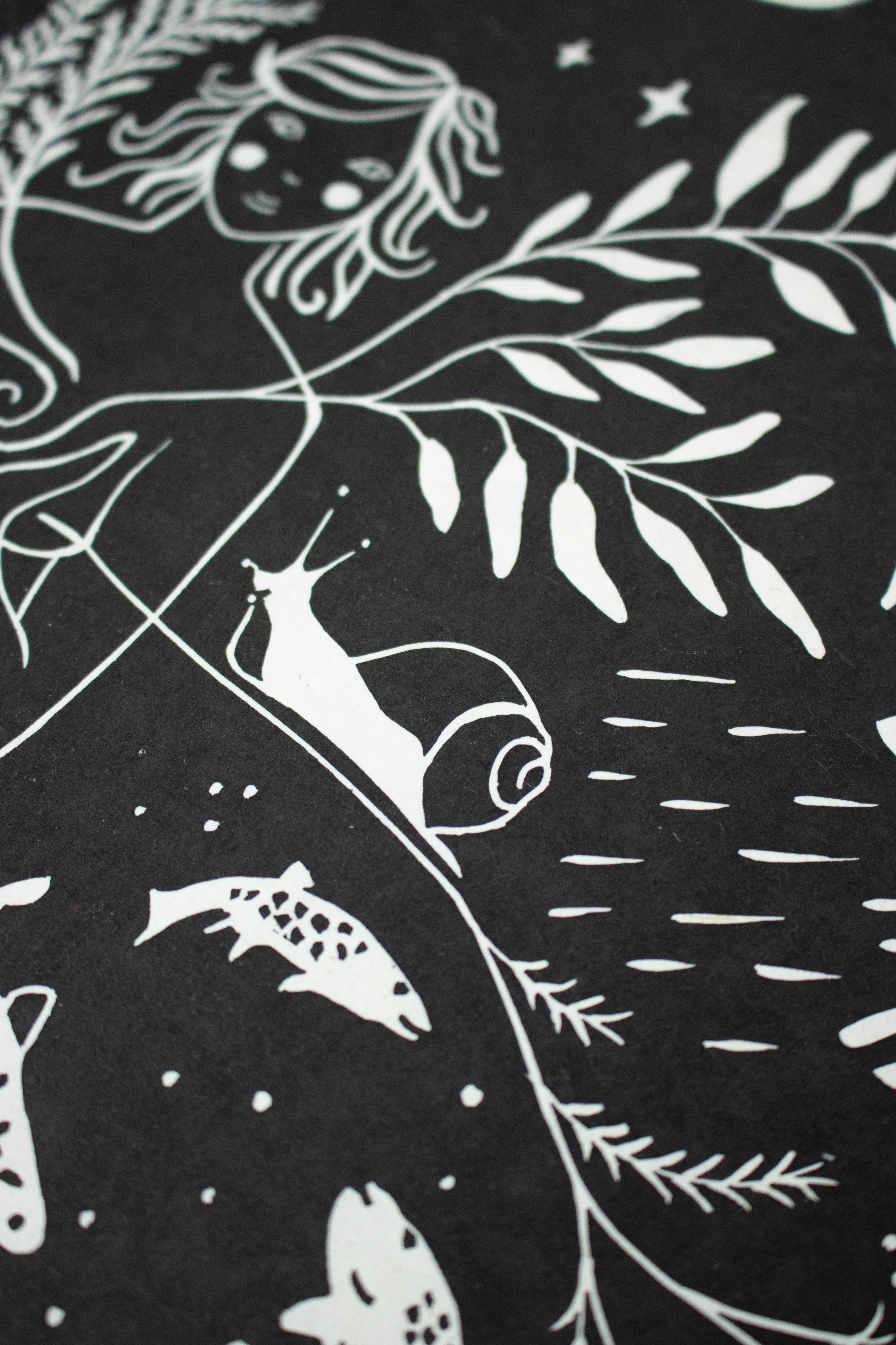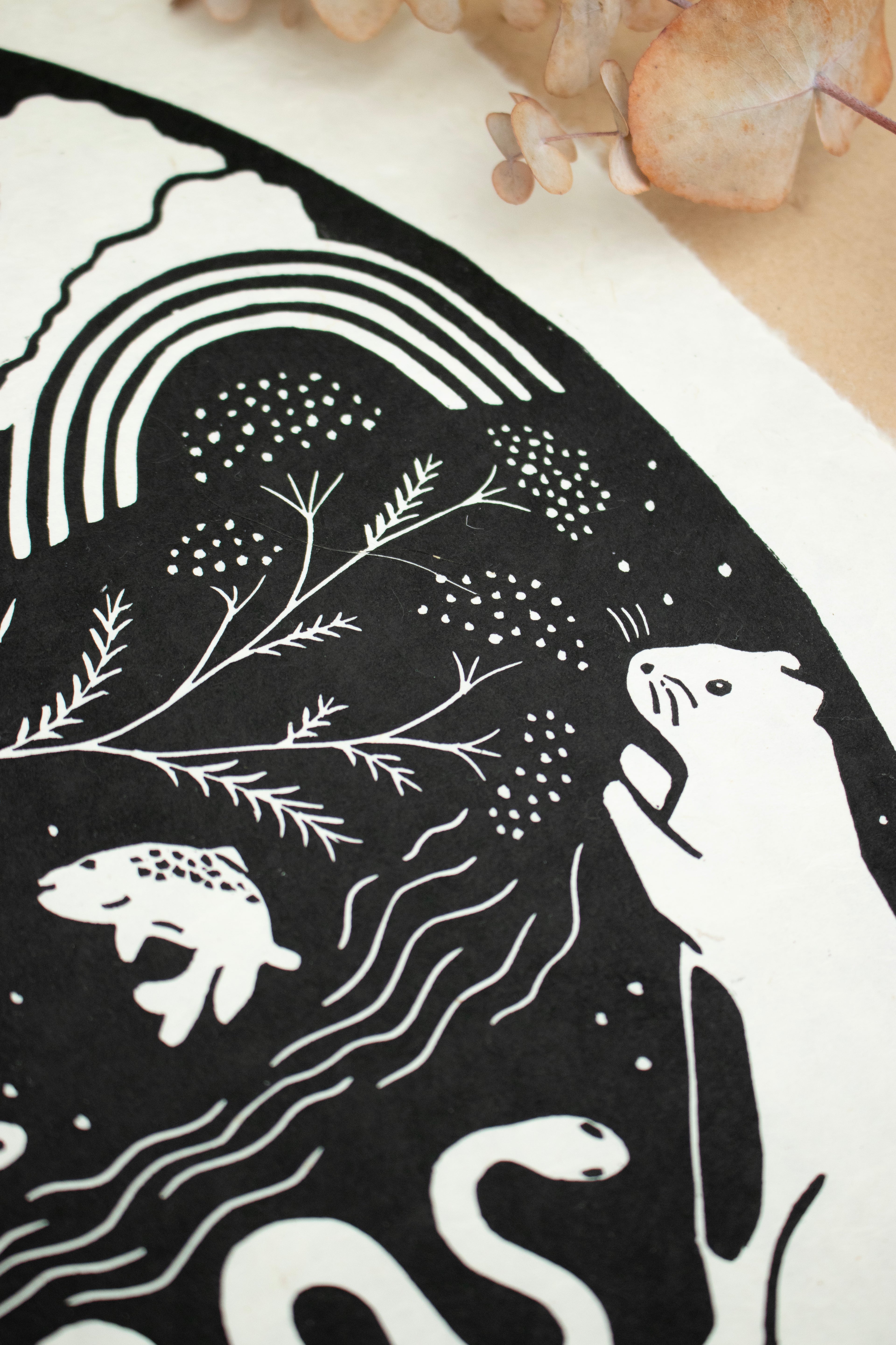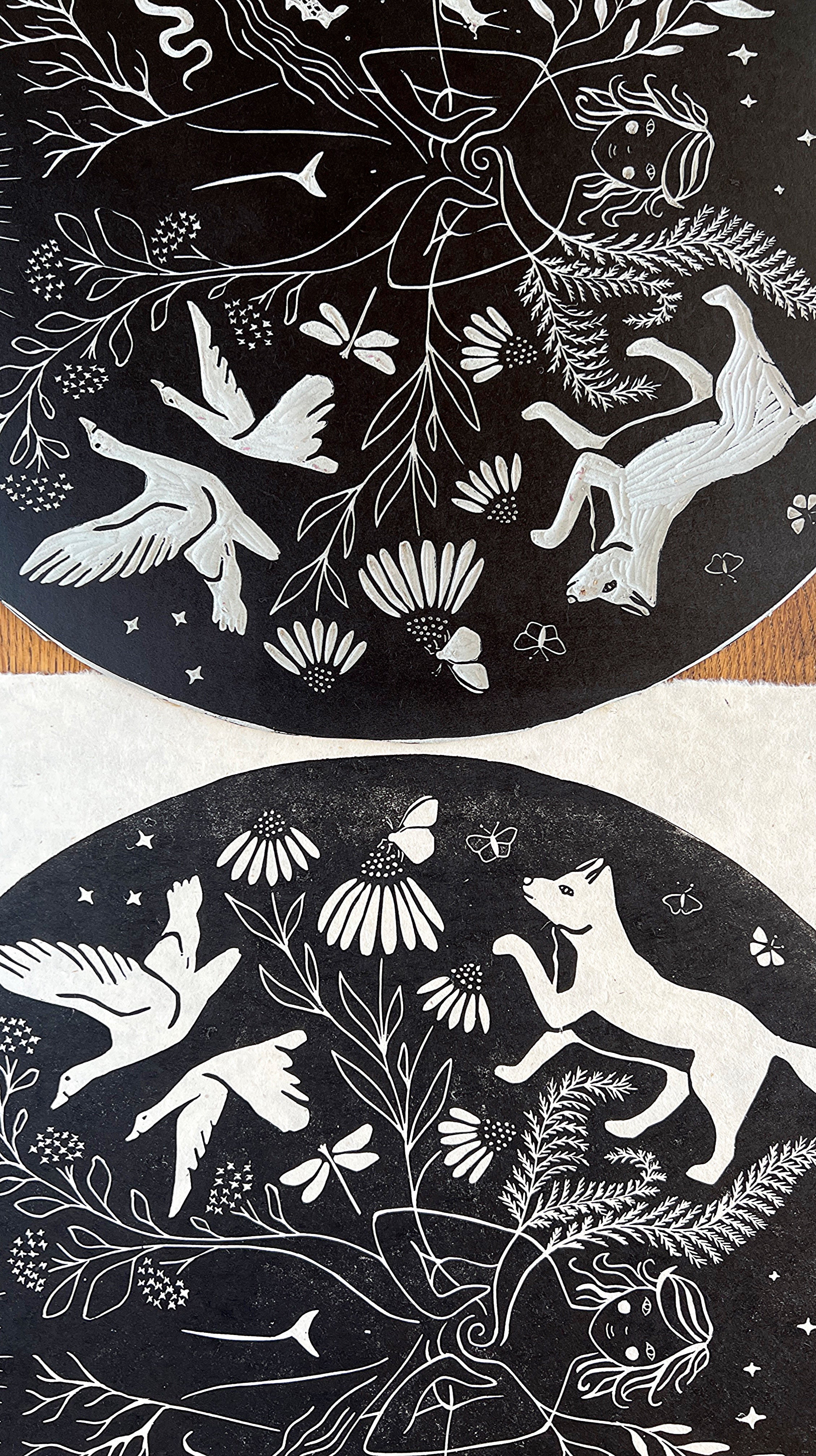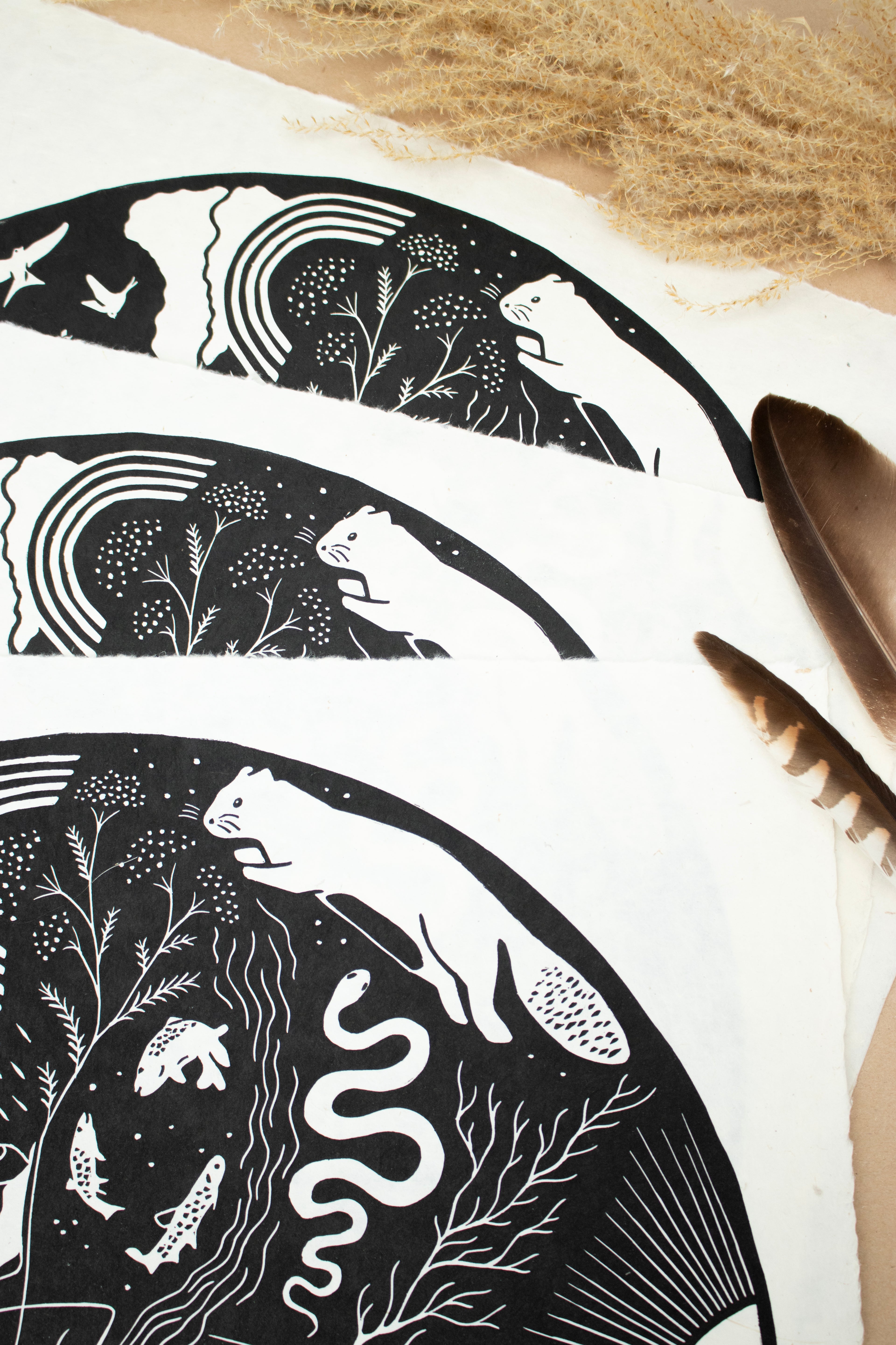 Dieser Linoldruck repräsentiert die Fülle in mir, in dir – sie entsteht aus der tiefen, immer bestehenden Verbundenheit zu all den Wesen, die ich so sehr liebe. Dieses Gefühl von Verbindung schenkt mir Freude und Ruhe – es gibt mir ein Gefühl von Zugehörigkeit und Erdung, eingebettet in eine große Familie aus Pflanzen und Tieren. Mögest auch du dich durch sie eingebettet in die Landschaft um dich herum fühlen.